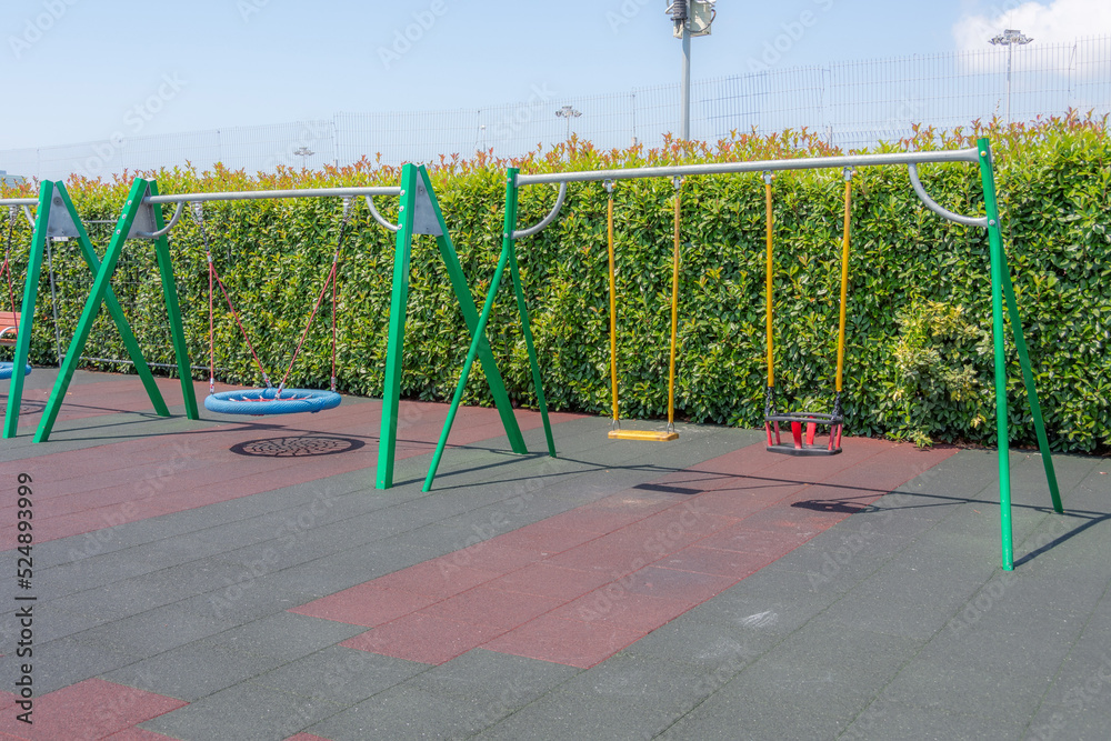 Empty children's swing and round mesh in the park in yellow and red on the background of hedge bushes.