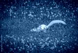 Adorable white squirrel runs through a clover filled meadowin Pisgah Forest