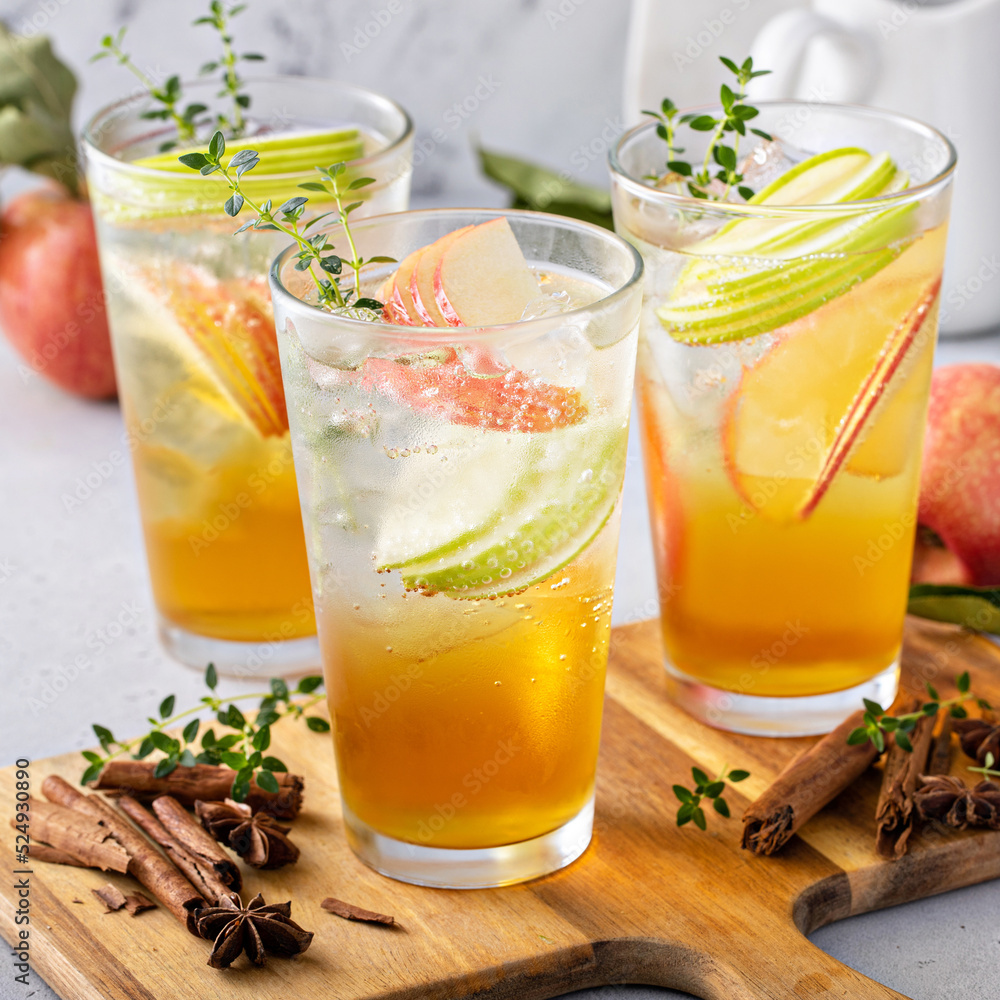 Refreshing apple cocktail or mocktail with ice and sliced apples