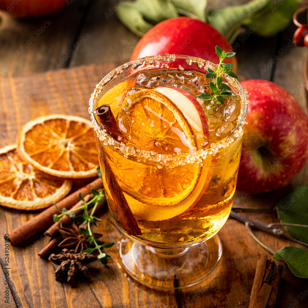 Festive fall cocktail or mocktail with hard cider, apple and orange