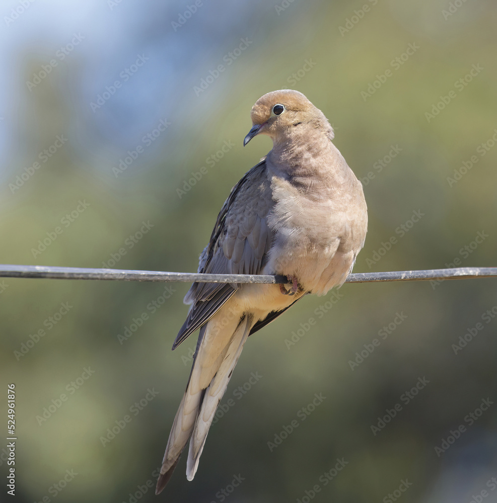 Mourning Dove adult perching on electric wire. Alameda County, California, USA.