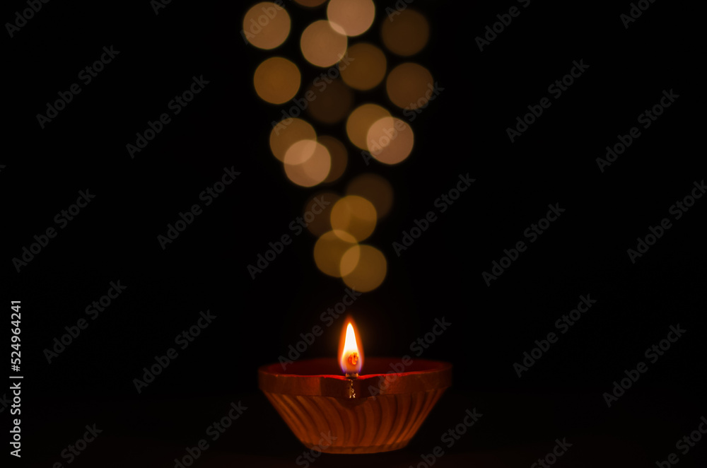 Selective focus on flame of clay diya lamp lit on dark background with bokeh lights. Diwali festival concept.
