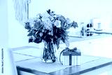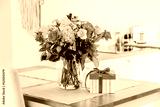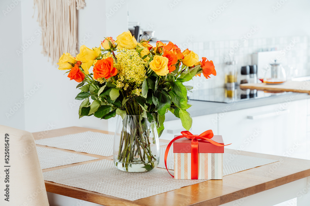 Yellow and orange roses in a vase and gift box with red ribbon on kitchen counter table with modern kitchen background. Gift for Thanksgiving day, birthday, Mother's or Valentine's day. Copy space