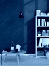 Trendy home living room interior with wood coffee table, modern bookshelf and stylish blue wall