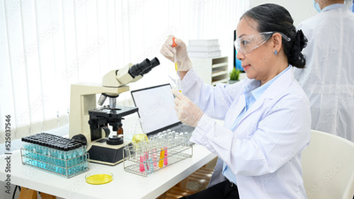 Concentrated asian-aged female scientist or chemist working in the laboratory.