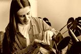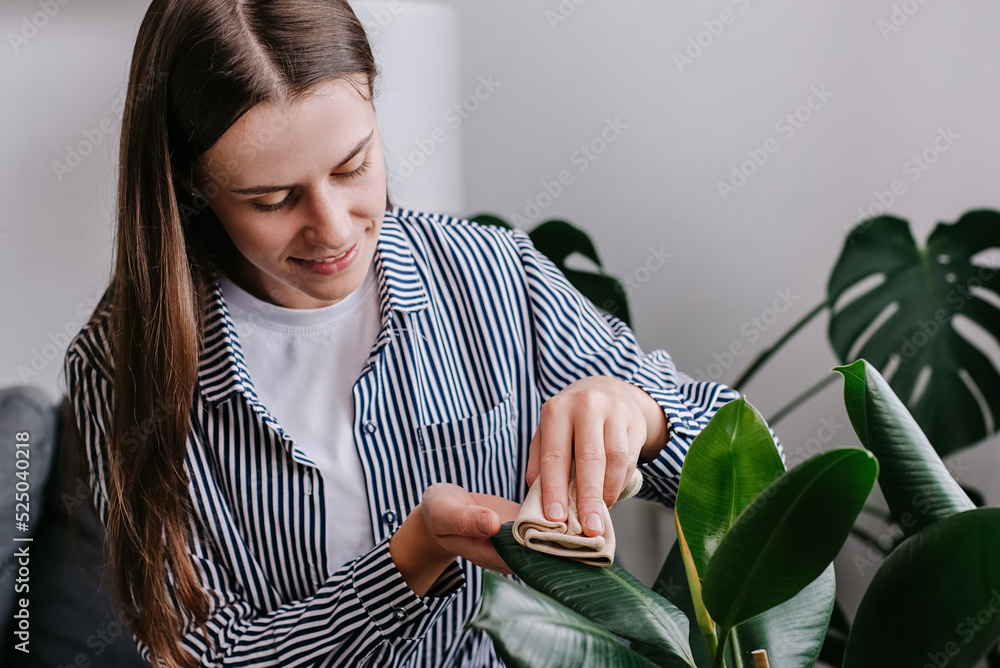 Close up of smiling young woman wiping dust from big green leaves of plant. Positive caring millennial lady cleans indoor plants, takes care leaf. Gardening, housewife and housework chores concept