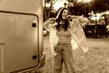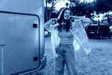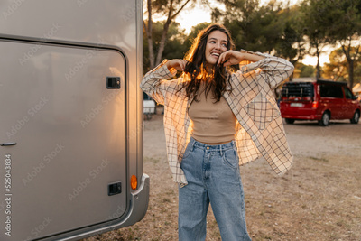 Pretty young caucasian woman with smile is enjoying her vacation in campsite during day. Brunette wears tank top, shirt and jeans. Positive emotions concept