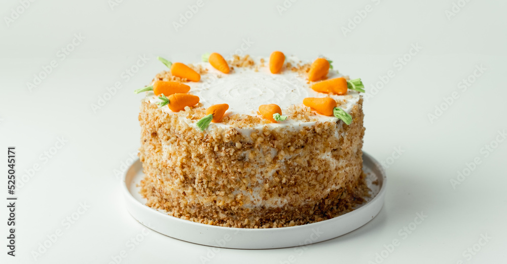Delicious carrot cake decorated with mastic sweet carrots. Homemade carrot cake with yellow crumbs in the white plate on the white background