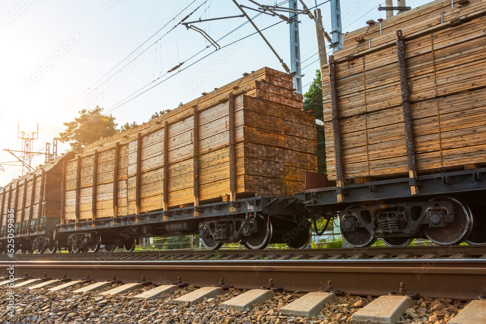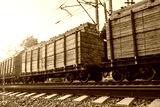 Treated wood blocks boards loaded onto freight wagons, sent by train to destination.