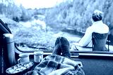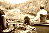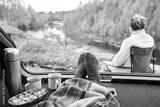 travel, tourism and camping concept - view to river from car trunk with feet in warm socks under blanket, two cups of tea, thermos and cookies