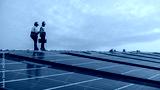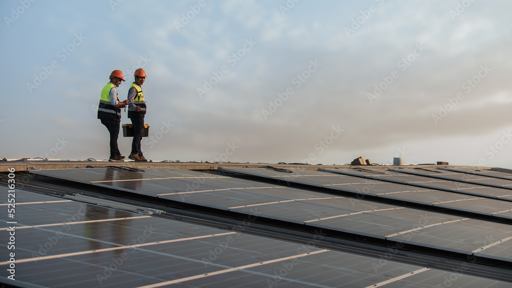 Service Engineers inspecting factory roof solar installations in the morning Silhouette technicians inspect and repair solar cells on factory roof.