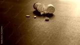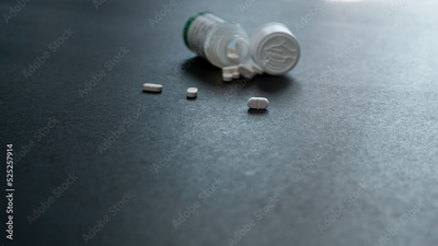 White tablets pills and blur plastic pill bottle on dark floor. Prescription drugs. Pharmaceutical industry. Medical care. Medication for cure illness. Pharmacy. Small white pills. Dose recommended.