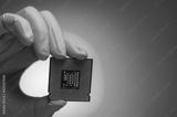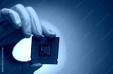 Electronic engineer hand holding computer chip blue background. Chipset of electronic circuit board for PC motherboard. CPU chip. Electronic components. Computer hardware. Computer processor chip.