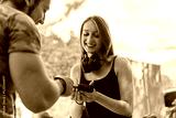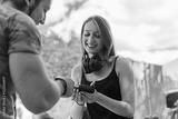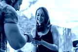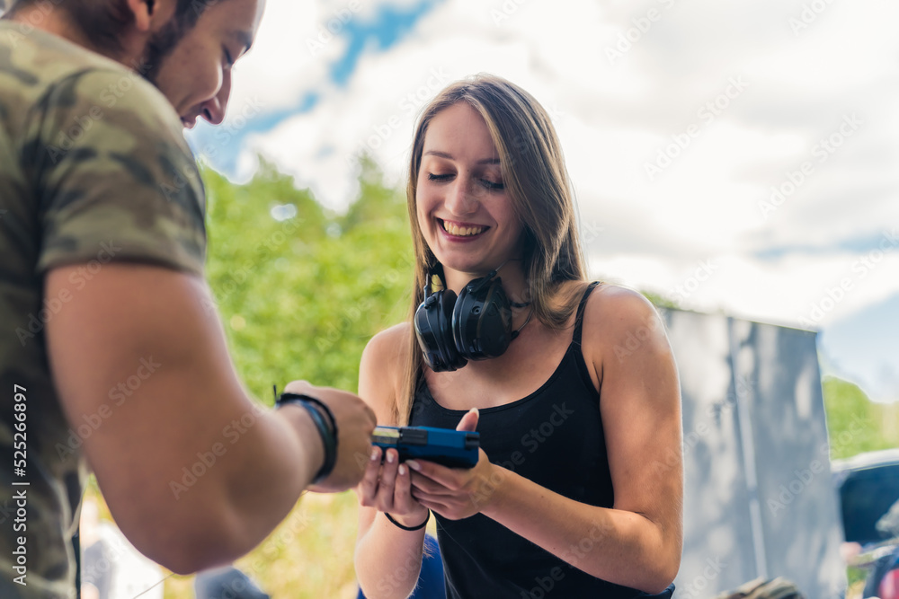 Hobby concept. Happy smiling caucasian young woman with protective headphones on her neck talking to male gun reseller. Outdoor shot. High quality photo
