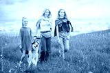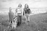 Siberian husky and family of his owners cheerfully run along the road together against the backdrop of a panoramic view, summer rural landscape.
