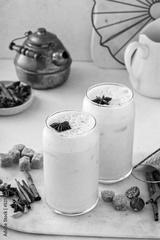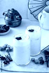 Iced chai latte with warm winter spices topped with milk foam