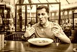 A man tries a spicy and hot red soup in a restaurant and reacts funny emotionally. Seasonings in the national cuisine and an unhealthy diet with overabundance of pepper