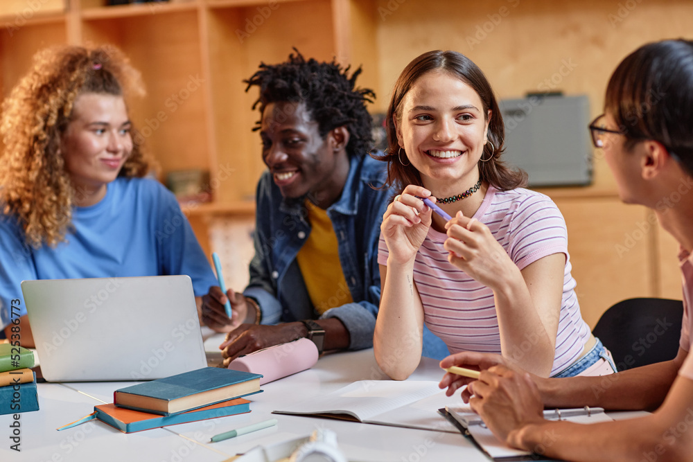 Diverse group of students working at table in library together, focus on smiling young woman talking to friends