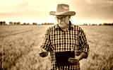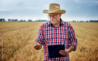 The crop is good this year. Farmer in a wheat field checking crop. Agricultural concept
