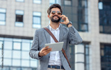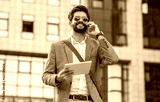 Businessman holding tablet and making a phone call in front of the corporation. Business, lifestyle concept