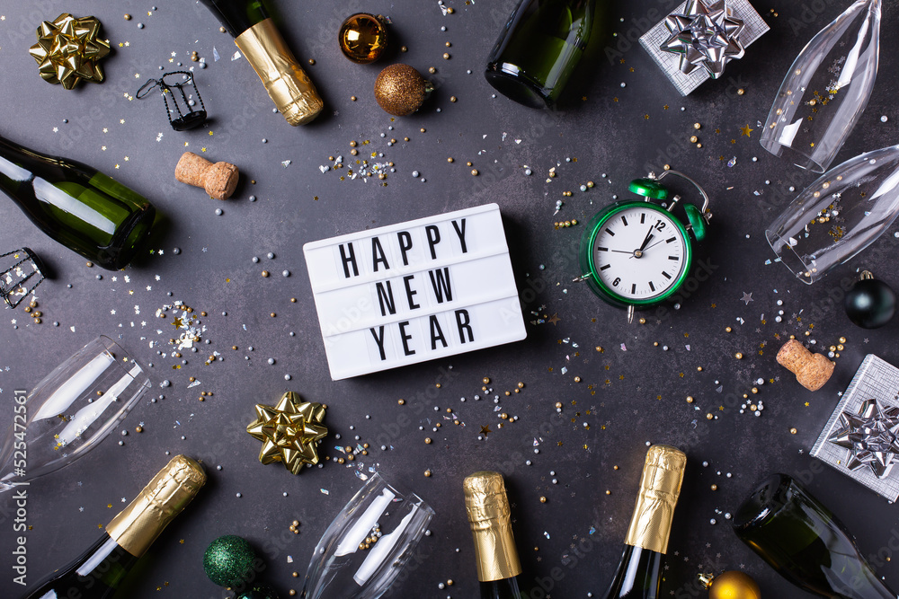 Happy New Year greeting card, champagne glasses and bottles, confetti