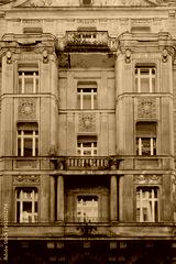 Facade of a building. Beige color, white windows. Urban architecture. with balcony and beautiful decoration.