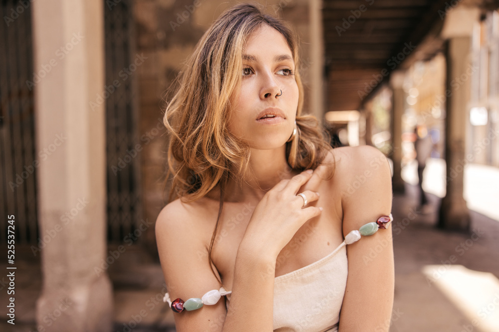 Stylish young caucasian woman bites her lip, looks away walking around city during day. Blonde with wavy hair wears summer sundress. Concept of enjoyment