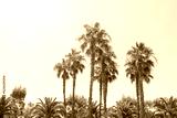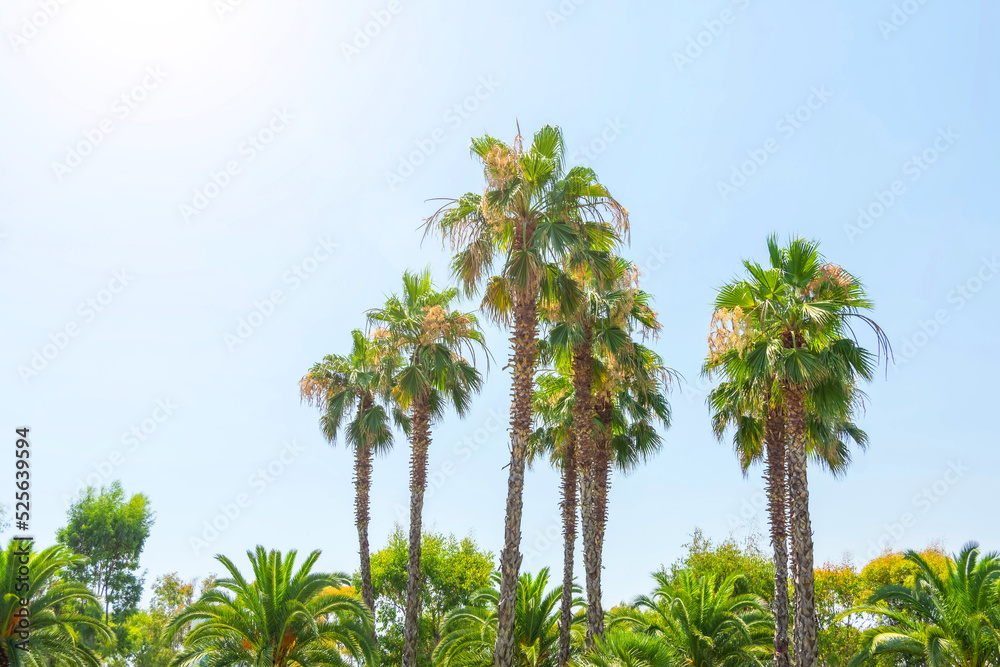 Blooming tall palm trees planted in the city garden.