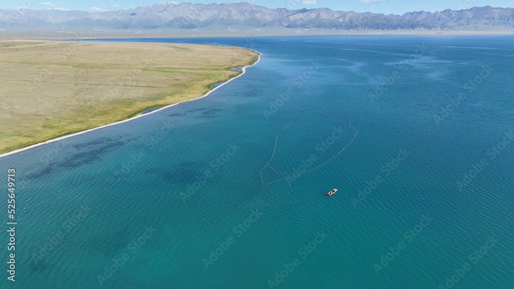 Drone view of a boat in the sea with a grass field and mountains in the background