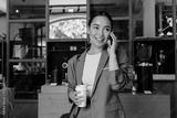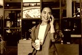 Asian businesswoman drinking coffee and talking on cellphone in cafe