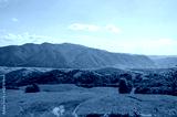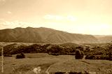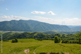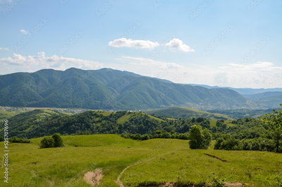 Summer mountain landscape with green rolling hills and the village in the valley in to the distance. Kolochava Transcarpathia, Carpathian Mountains, Ukraine