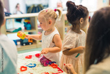 Relaxing sensory play with moldable kinetic sand at nursery school. Toddlers with their teacher having fun around the table using different tools for sculpting sand such as colorful and textured