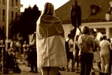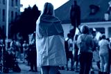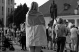In focus: migrant blond woman stands in crowd (square) and covers shoulders by Ukrainian blue and yellow flag. Back view. Horizontal plane