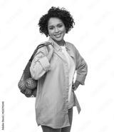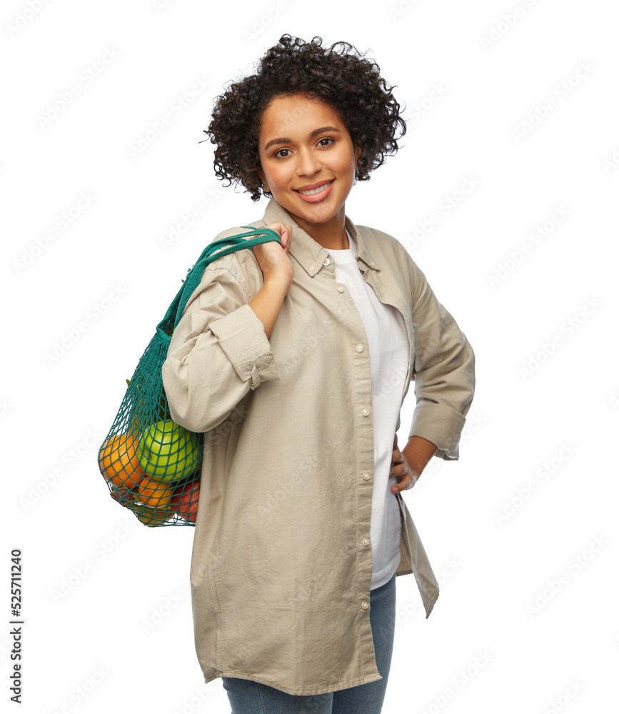 sustainability, food shopping and eco friendly concept - happy smiling woman holding reusable string bag with fruits and vegetables over white background