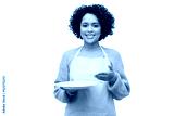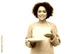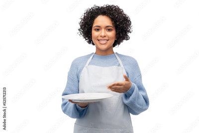 cooking, culinary and people concept - happy smiling woman in apron holding empty plate over white background