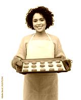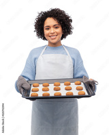 cooking, culinary and people concept - happy smiling woman in apron holding baking tray with oatmeal cookies over white background