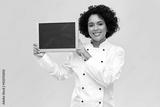 cooking, advertisement and people concept - happy smiling female chef in white jacket holding black chalkboard over grey background