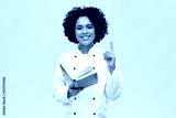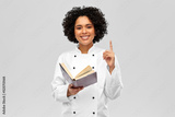 cooking, culinary and people concept - happy smiling female chef in white toque and jacket reading cook book over grey background