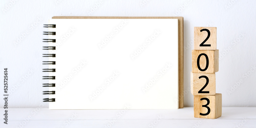 2023 wooden cubes and blank notebook paper on table and white cement wall background, banner with copy space for text, new year greeting card template