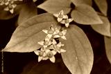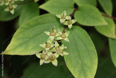 Close-up of Mock orange tree with green seeds on selective focus. Philadelphus tree on summer