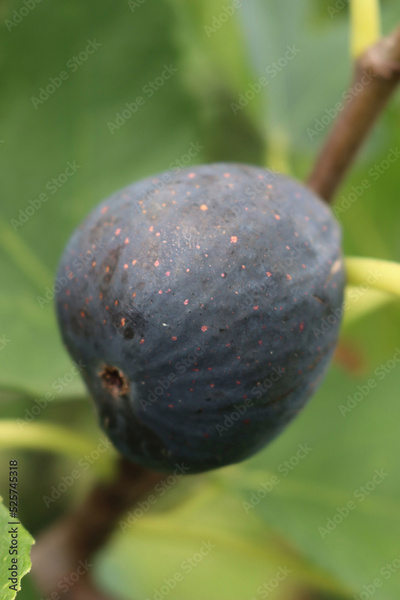 Close-up of ripe purple fig on tree in the garden. Ficus carica tree on late summer