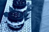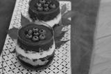 Traditional Italian dessert called Tiramisu with mousse and chocolate cookies and fresh blueberries in glass. Homemade layered cakes on table on selective focus