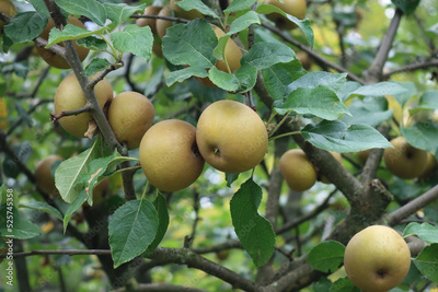 Golden Russset (italian Ruggine) apples growing on branches in the orchard on late summer