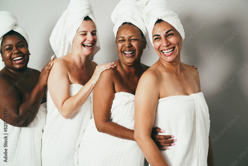 Multigeneration women with diverse skin and body laughing together while wearing body towels - Focus on right woman face