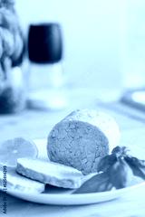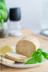 Raw Tempeh or Tempe, made of fermented soybean seeds on kitchen table. Tempeh Slices on the plate. Soya protein. Plant based meat. Healthy eating. Go vegan. Vertical card. Selective focus, copy space