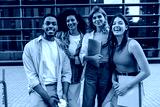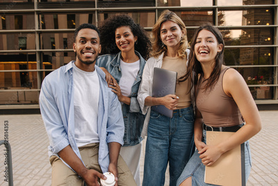 Happy young interracial students guy and girl looking at camera standing outdoors. People wear casual clothes and hold study items. Lifestyle concept