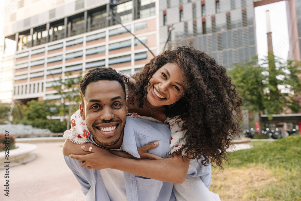 Cheerful young african guy and girl enjoy spending time outdoors. Couple of brunettes are wearing casual summer clothes. Modern lifestyle, youth concept