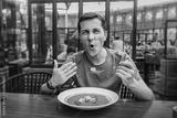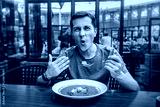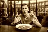 A man tries a spicy and hot red soup in a restaurant and reacts funny emotionally. Seasonings in the national cuisine and an unhealthy diet with overabundance of pepper