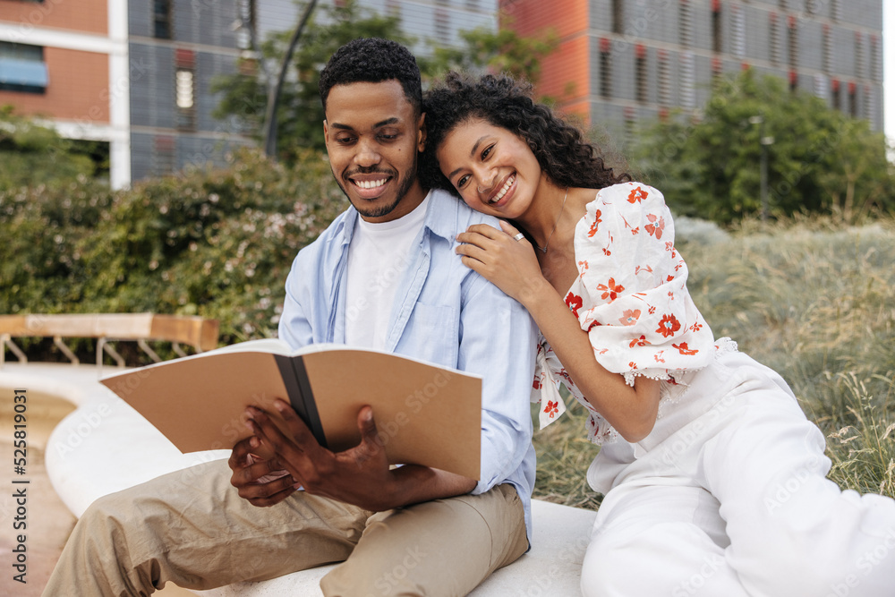 Smiling african young couple of students looking through notes in notebook sitting outdoors. Brunette guy and girl wear casual clothes. Study concept