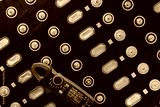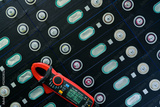 Electric vehicle lithium NMC battery with multimeter. Electric car battery manufacturing factory. Lithium-ion cell. Lithium NMC rechargeable battery. EV car energy storage. Automotive battery cell.
